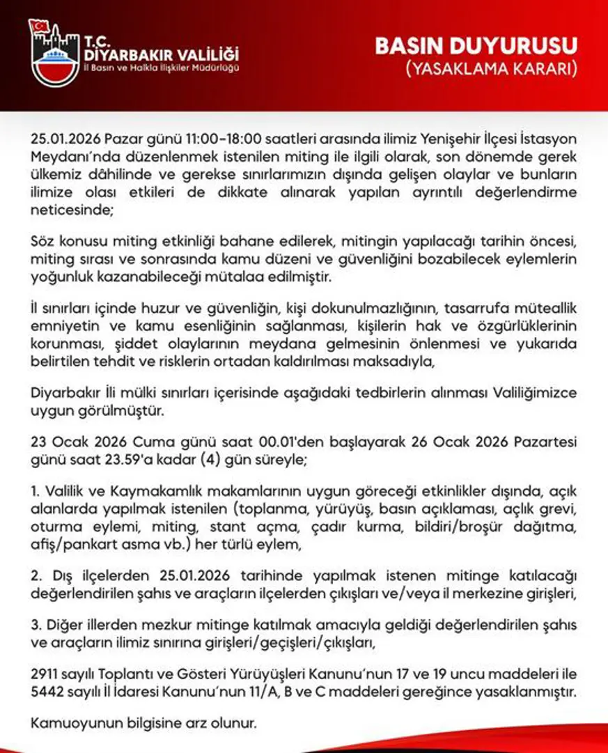 Diyarbakır Valiliğinden yapılan açıklamada, ‘’25 Ocak Pazar günü 11.00-18.00 saatleri arasında ilimiz Yenişehir ilçesi İstasyon Meydanında düzenlenmek istenilen miting ile ilgili olarak, son dönemde gerek ülkemiz dahilinde ve gerekse sınırlarımızın dışında gelişen olaylar ve bunların ilimize muhtemel etkileri de dikkate alınarak yapılan ayrıntılı değerlendirme neticesinde söz konusu miting etkinliği bahane edilerek, mitingin yapılacağı tarihin öncesi, miting sırası ve sonrasında kamu düzeni ve güvenliğini bozabilecek eylemlerin yoğunluk kazanabileceği mütalaa edilmiştir. İl sınırları içinde huzur ve güvenliğin, kişi dokunulmazlığının, tasarrufa müteallik emniyetin ve kamu esenliğinin sağlanması, kişilerin hak ve özgürlüklerinin korunması, şiddet olaylarının meydana gelmesinin önlenmesi ve yukarıda belirtilen tehdit ve risklerin ortadan kaldırılması maksadıyla Diyarbakır ili mülki sınırları içerisinde aşağıdaki tedbirlerin alınması valiliğimizce uygun görülmüştür. 23 Ocak 2026 Cuma günü saat 00.01'den başlayarak 26 Ocak 2026 Pazartesi günü saat 23.59'a kadar 4 gün süreyle valilik ve kaymakamlık makamlarının uygun göreceği etkinlikler dışında, açık alanlarda yapılmak istenilen toplanma, yürüyüş, basın açıklaması, açlık grevi, oturma eylemi, miting, stant açma, çadır kurma, bildiri, broşür dağıtma, afiş, pankart asma gibi her türlü eylem, dış ilçelerden 25 Ocak 2026 tarihinde yapılmak istenen mitinge katılacağı değerlendirilen şahıs ve araçların ilçelerden çıkışları ve/veya il merkezine girişleri, diğer illerden mezkur mitinge katılmak amacıyla geldiği değerlendirilen şahıs ve araçların ilimiz sınırına girişleri, geçişleri çıkışları, 2911 sayılı Toplantı ve Gösteri Yürüyüşleri Kanunu'nun 17 ve 19 uncu maddeleri ile 5442 sayılı İl İdaresi Kanununun 11/A, B ve C maddeleri gereğince yasaklanmıştır’’ denildi.