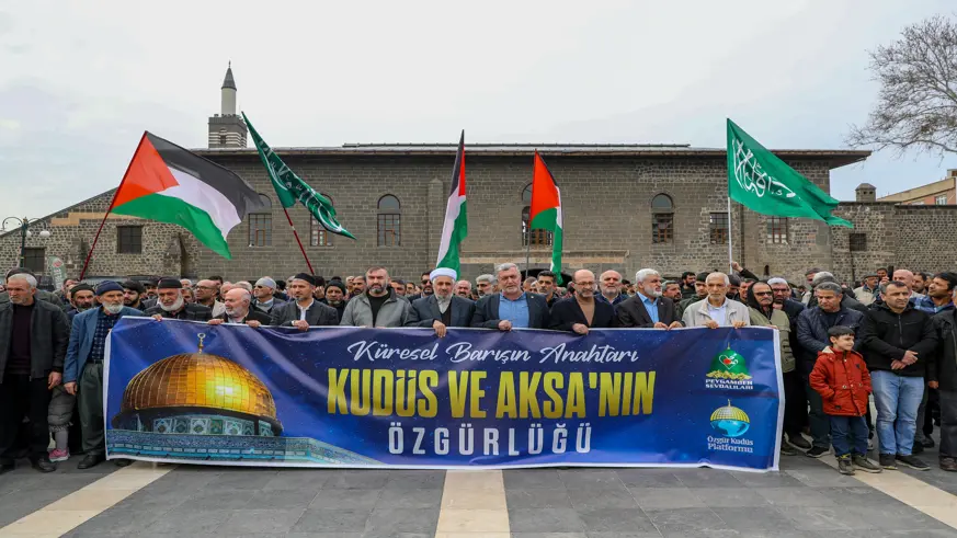 Diyarbakır'da Peygamber Sevdalıları Vakfı, Alimler ve Medreseler Birliği (İttihad-ul Ulema) ve Özgür Kudüs Platformu öncülüğünde merkez Sur ilçesindeki Ulu Cami önünde bir araya gelen katılımcılar, tekbir getirip ABD ve İsrail karşıtı sloganlar attı.