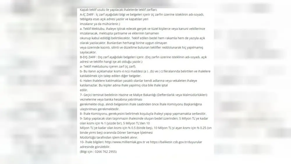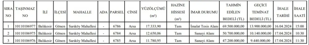 Sakarya ve Balıkesir illerinde bulunan dört değerli arsa için düzenlenecek olan ihaleler yaklaşıyor. Balıkesir’deki arsaların tahmini değerleri 47,2 milyon TL’den başlayıp 69,5 milyon TL’ye kadar ulaşırken, Sakarya’daki arsanın tahmini değeri ise 84 milyon TL olarak belirlendi.