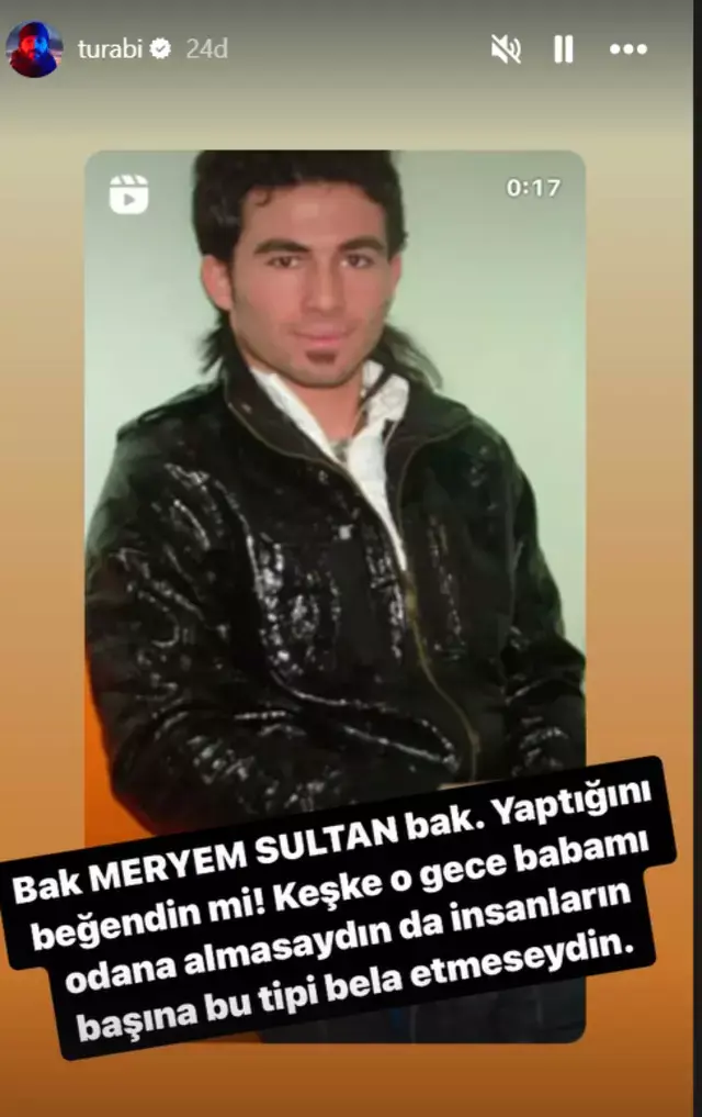 Turabi, gençlik fotoğrafı paylaşımının ardından ismini açıklamadığı birine göndermede bulunduğu bir paylaşım daha yaptı. Bu paylaşımda Turabi, "Bak Meryem Sultan bak! Yaptığını beğendin mi? Keşke o gece babamı odana almasaydın da insanların başına bu tipi bela etmeseydin." ifadelerini kullandı. Turabi'nin bu paylaşımının ne anlama geldiği ise tam olarak anlaşılmadı.