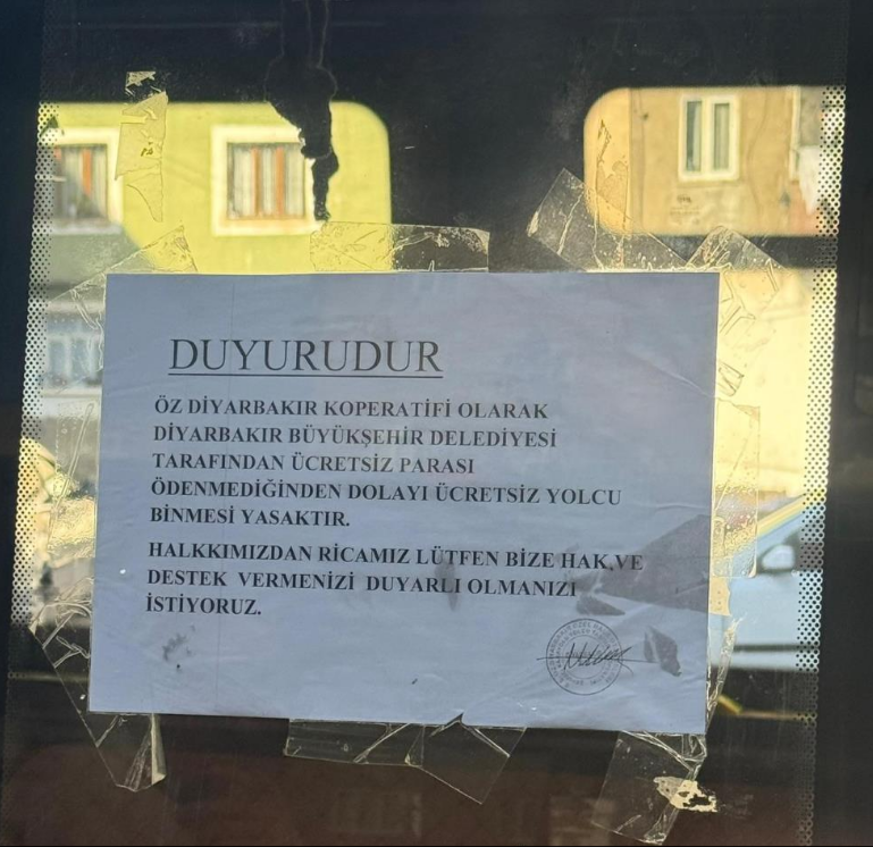 Öz Diyarbakır Kooperatifi tarafından asılan duyurularda, Diyarbakır Büyükşehir Belediyesi tarafından ücretsiz taşıma ücretlerinin ödenmediği belirtilerek şu ifadelere yer verildi: "Öz Diyarbakır Kooperatifi olarak, Diyarbakır Büyükşehir Belediyesi tarafından parası ödenmediğinden dolayı ücretsiz yolcu binmesi yasaktır. Halkımızdan ricamız, lütfen bize hak ve destek vermenizi, duyarlı olmanızı istiyoruz".