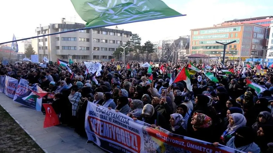 Van Filistin'e Destek Platformu ve Van Sivil Dayanışma İnisiyatifi öncülüğünde Beşyol Meydanı’nda toplanan binlerce vatandaş, Kent Meydanı’na kadar yürüdü. Burada Kur’an-ı Kerim tilavetiyle başlayan basın açıklamasını Van Filistin'e Destek Platformu Dönem Sözcüsü Ahmet Faruk Çevik okudu. Çevik, "Ümmet coğrafyası ateş çemberinde, Siyonist İsrail ve işbirlikçisi ABD bölgemizi yakıp yıkmaya devam ediyor. Çocuklar, kadınlar ve masumlar gözlerimizin önünde her gün katlediliyor. Bizlere evlerimizde oturmak yakışmaz, işte bugün zalime karşı mazlum kardeşlerimizin yanında olduğumuzu haykırmak ve tüm dünyada bu zalimleri lanetlemek ve zulmün durdurulmasını da bizleri yönetenlerden istemek için bir araya geldik. Bizler, bölgemizde yürütülen kirli senaryoları, zulmü ve katliamları lanetliyoruz. Bölge halklarının iradesini yok sayan, sınırları kanla yeniden çizmeyi hedefleyen hiçbir askeri girişimi, işgali ya da saldırıyı kabul etmiyoruz. Kendi topraklarımızda hem işgalci İsrail’i hem de bölgeyi kaos bataklığına çeviren Amerikan askeri varlığını reddediyoruz" dedi.