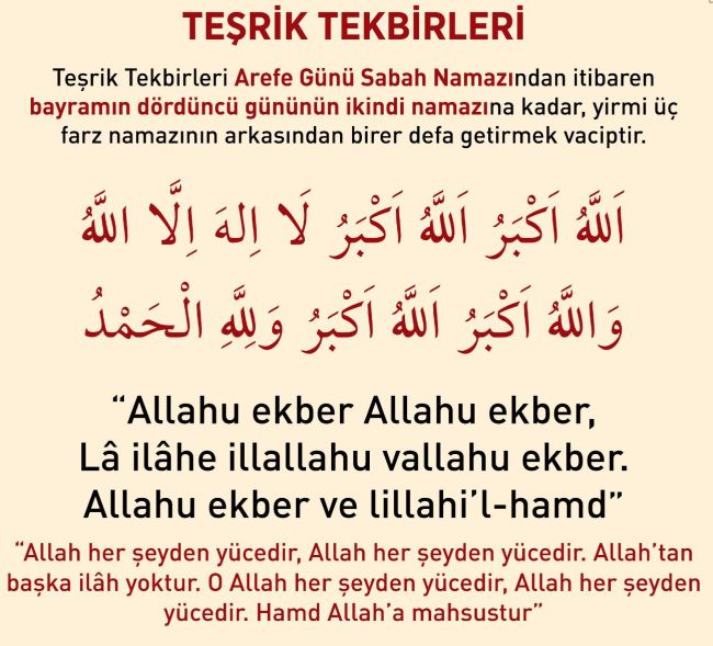 Teşrik tekbiri arife günü sabah namazı ile başlar, bayramın 4. günü ikindi namazıyla biter.