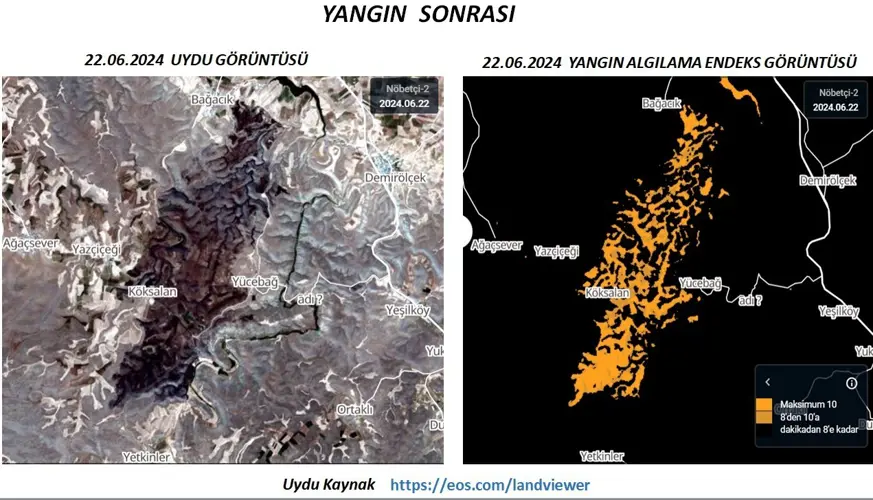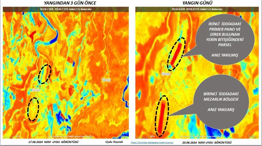 Yangının iki farklı özel mülkte gerçekleştirilen anız yakmadan kaynaklandığını aktaran Atalay, “Bazı medya organları ve sosyal medya kanallarında yangının elektrik kaynaklı olduğu iddia edilmiş olsa da, biz elektrik hatlarından kaynaklanmadığını kanıtlarıyla beraber tekrar ifade ediyoruz. 17 Haziran 2024 ve 20 Haziran 2024 tarihlerinde Sentinel 2 uydusundan aldığımız görüntülerde de görüleceği üzere, yangının anız yakımından kaynaklı olduğu görülmektedir. Nem ve ısı göstergeleri de anız yakımının, yangından saatler önce parsellerin çevrilerek planlı bir şekilde yapıldığını net olarak gösteriyor. Arazinin, anız yakımı olmadığını iddia eden ve valilik açıklamasını da yalanlayarak yangının elektrik tellerinin tutuşmasından kaynaklandığını belirten sözde görgü tanığının ailesine ait olduğu tespit edildi. Yangının meydana geldiği diğer arazinin de bir başka tanığın ailesine ait bir alan olduğu da tespit ettik” şeklinde konuştu.