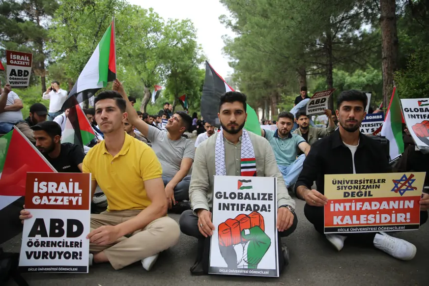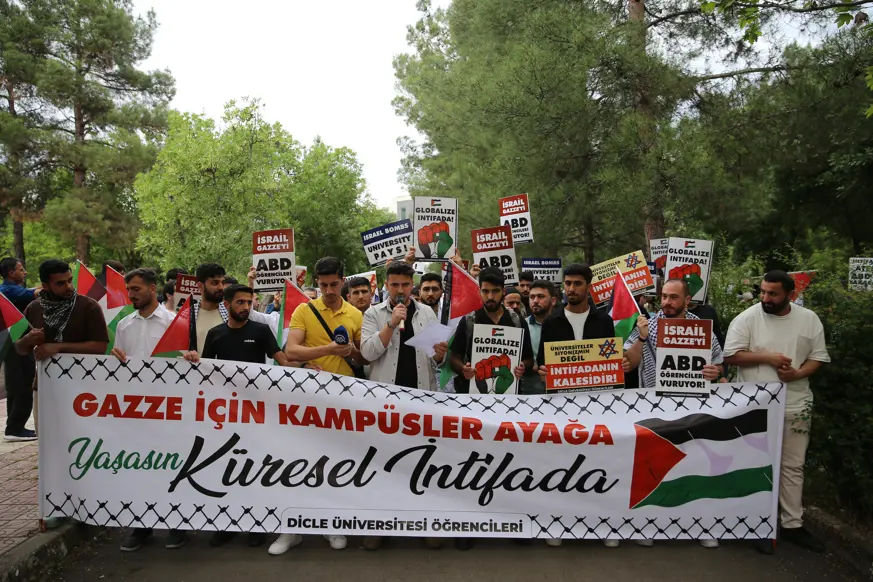 DÜ Fen Fakültesi önünde bir araya gelen ve bir süre oturma eylemi yapan öğrenciler adına basın açıklamasını okuyan Ali Fuat Bilgin, İsrail'in Gazze'ye yönelik saldırılarının insanlık tarihinin en vahşi katliamlarından olduğunu söyledi.