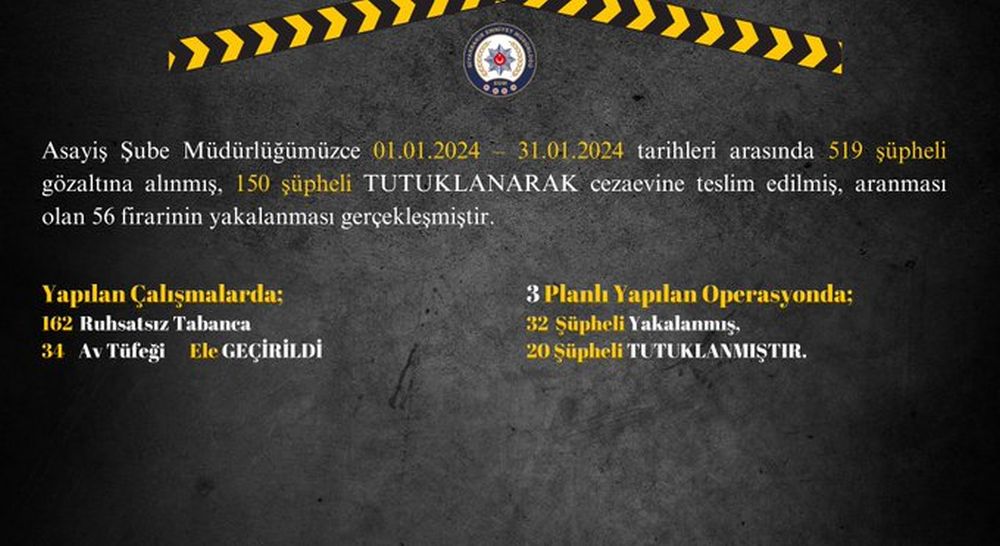 Diyarbakır Emniyetinden edinilen bilgilere göre; Asayiş Şube Müdürlüğüne bağlı ekiplerce 01.01.2024 ve 31.01.2024 tarihleri arasında yapılan "Suçla Sinerjik Mücadele" 519 şüpheli gözaltına alındığı operasyonlara ilişkin sosyal medya hesabından yapılan paylaşımda;