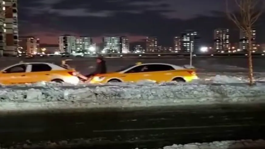 Olay Diyarbakır’ın Yenişehir ilçesinde meydana geldi. Yolda kalan bir ticari taksiye başka bir taksinin kaputuna çıkan vatandaş yardım etti. Seyir halinde ayakları ile öndeki aracın ilerlemesine destek olurken, yolda kalan aracın bagajında da bir vatandaş öndeki araçtan destek aldı.