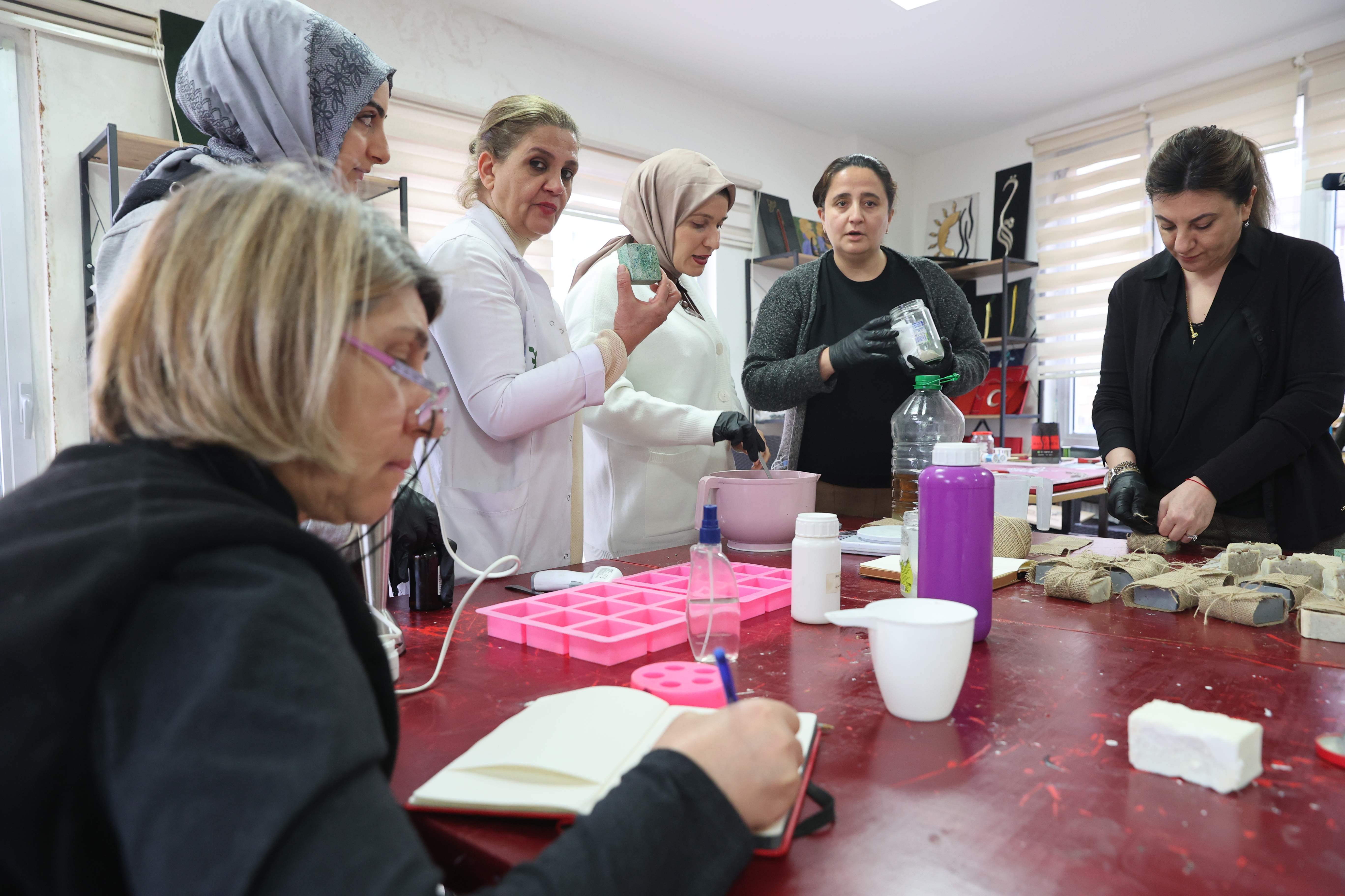 Proje kapsamında 25 öğretmen ve idareci, Sabun Atölyesi'nde usta öğreticiler eşliğinde stresten uzaklaşarak mesleki motivasyonlarını arttırmak için geleneksel ve doğal yöntemlerle sabun yapımını öğreniyor.