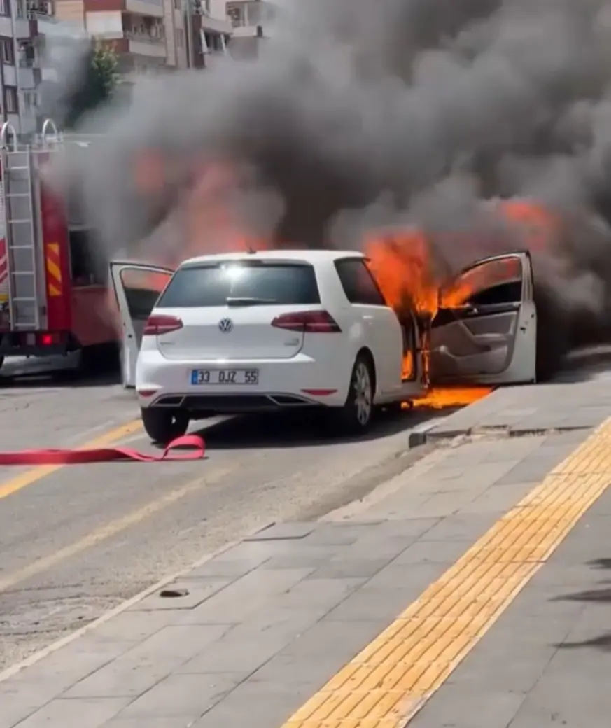 Peyas Mahallesi Selahattin Eyyubi Bulvarı'nda park halindeki 33 DJZ 55 plakalı otomobil, henüz bilinmeyen bir nedenle yandı.