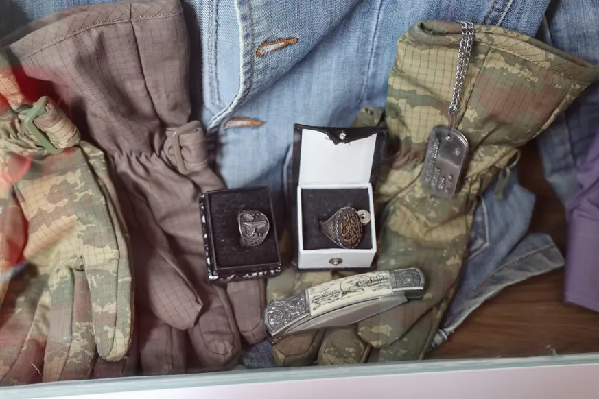 Bu oda da, oğlum koyu Galatasaraylıydı. Galatasaray formaları var, fotoğrafı, beraatları, Fethi Sekin arkadaşıydı, onun fotoğrafı var. Bu bayrak, üstüne örtülen bayrak. Bu da mezarından alınan toprak. Bu da Fethi Sekin ile olan fotoğrafı.