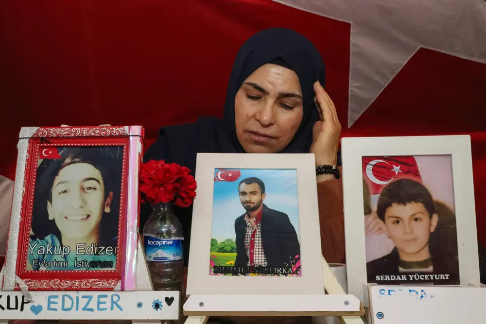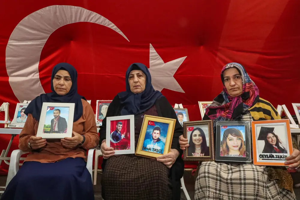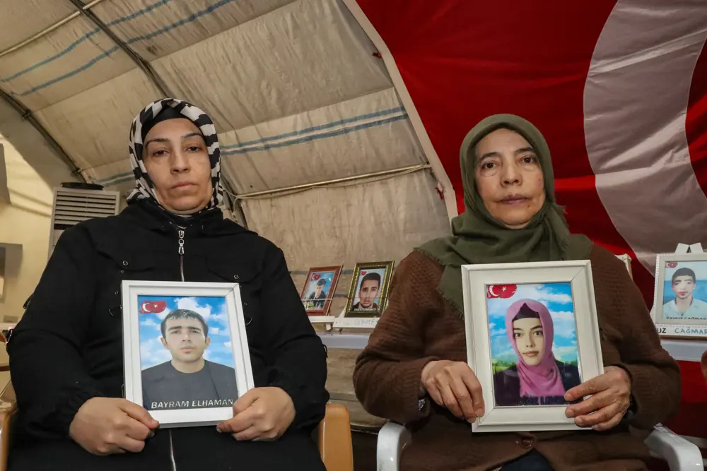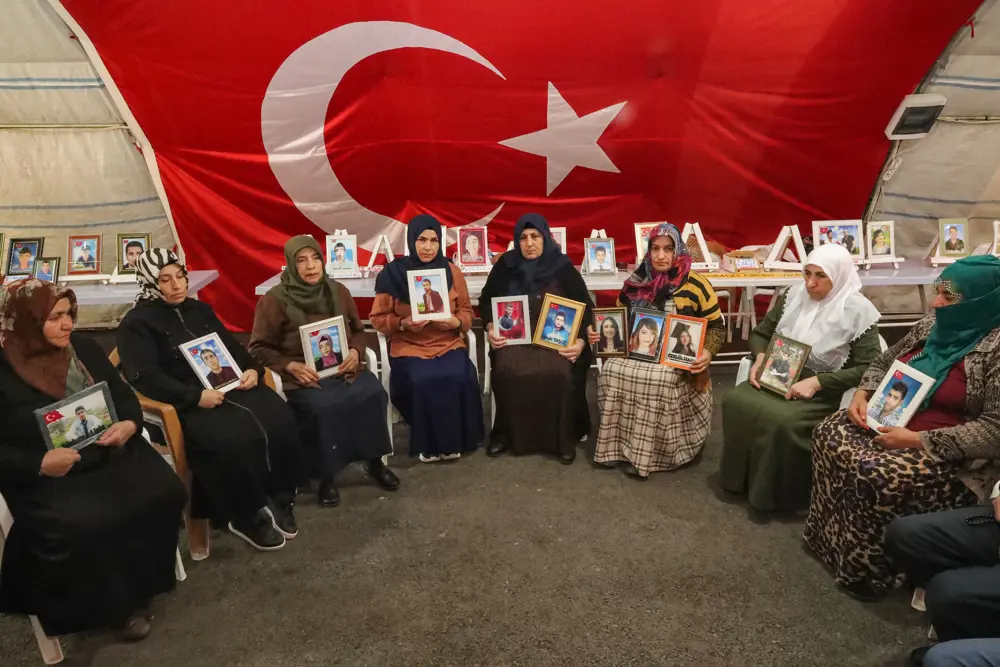 Ellerinde çocuklarının fotoğrafıyla eylem yapan diğer ailelerin, eski HDP il binası önünde evlat nöbetinde umutlu bekleyişi sürüyor.