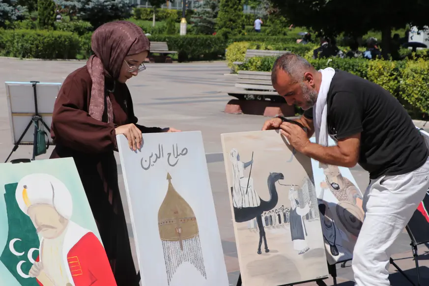 Bu illerde birer gün kaldıktan sonra Erzurum'a gelen baba kız, Filistin'in tarih boyunca kahramanları ile 7 Ekim'den bu yana İsrail'in Gazze'ye saldırılarını anlatan görsellerin bulunduğu sergiyi Yakutiye Kent Meydanı'nda açtı.