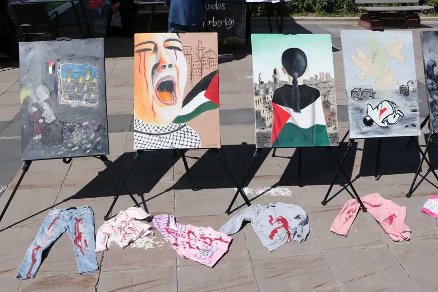 Güzel, serginin, Filistin'in tarih boyu fatihleri, sanatsal çizimler ve İsrail'in Gazze'ye karşı soykırımı gibi 3 kategoriden oluştuğunu aktardı.