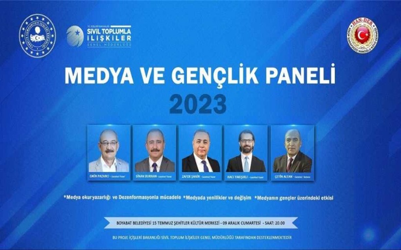 Gençlerin yeni medya düzeni, Dijital yayıncılık, dezenformasyon mücadele ve Sosyal Medya okuryazarlığı konusunda bilgilendirileceği panele Gazeteciler, Emin Pazarcı, Sinan Burhan, Zafer, Şahin, Hacı Yakışıklı ve Çetin Altan konuşmacı olarak katılacak.