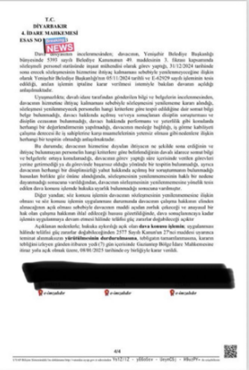 Diyarbakır İdare Mahkemesi, Dem Partili Diyarbakır merkez Yenişehir ve Kayapınar Belediyeleri tarafından bünyesinde sözleşmeli personelin sözleşmelerinin yenilenmemesi yönündeki kararın yürütmesini durdurdu.
