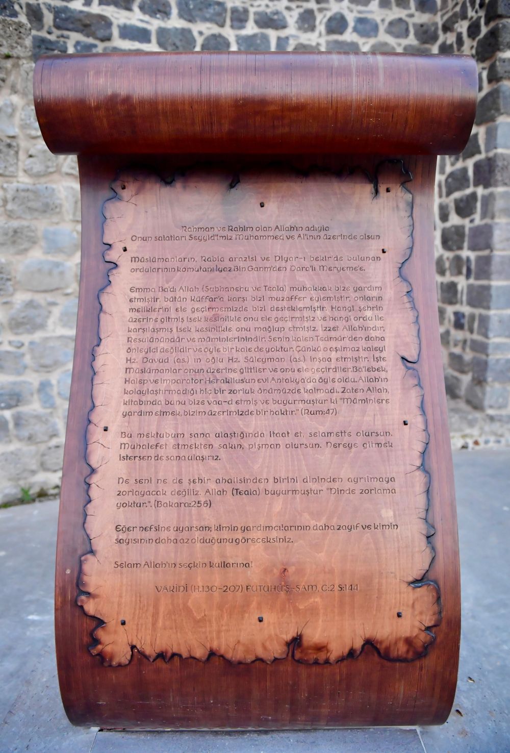 "Diyarbakır’ın 639’da İslam orduları tarafından kuşatılması sırasında, İslam ordularının başkomutanı İyaz bin Ganem'in (r.a.) Dariya topraklarının kraliçesi Meryem'e gönderdiği mektubu, fetih sırasında şehit olan 27 şehit sahabenin de metfun olduğu İçkale'de Küpeli Kapı girişinde vatandaşlarımızın bilgisine sunduk"