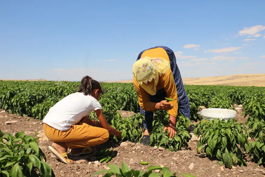 Çocuğuyla birlikte tarlada çalışan Çiçek Aslan ise, “Havalar çok sıcak. Tarlalara gelip ekmek parası çıkarıyoruz. İşimiz güneşin altında olduğu için çok zor oluyor. Saat 06.00'da başlayan mesaimiz 16.00'da bitiyor” dedi.