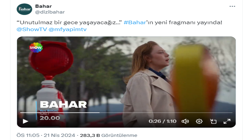 Başrolünde Demet Evgar'ın yer aldığı 'Bahar' dizisinin onuncu bölümünden yeni tanıtım fragmanı yayınlandı. Dizinin yeni bölümü yarın akşam Show Tv'de izleyiciyle buluşacak.
