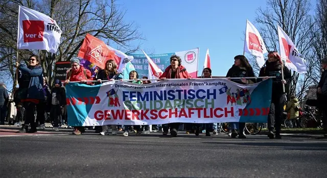 Almanya'nın başkenti Berlin'de flama ve dövizler taşıyan kadınlar arasında sendika üyeleri bir süredir hava ulaşımını sekteye uğratan grevler düzenleyen Verdi sendikası üyesi kadınlar, 8 Mart yürüyüşünde yer aldı.