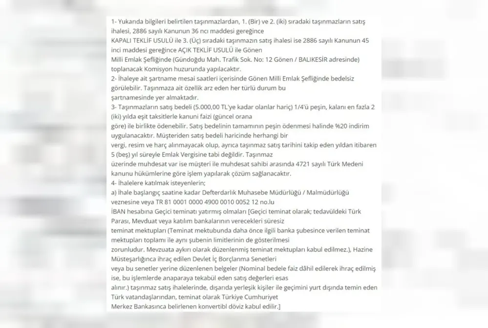 Sakarya ve Balıkesir illerinde bulunan dört değerli arsa için düzenlenecek olan ihaleler yaklaşıyor. Balıkesir’deki arsaların tahmini değerleri 47,2 milyon TL’den başlayıp 69,5 milyon TL’ye kadar ulaşırken, Sakarya’daki arsanın tahmini değeri ise 84 milyon TL olarak belirlendi.