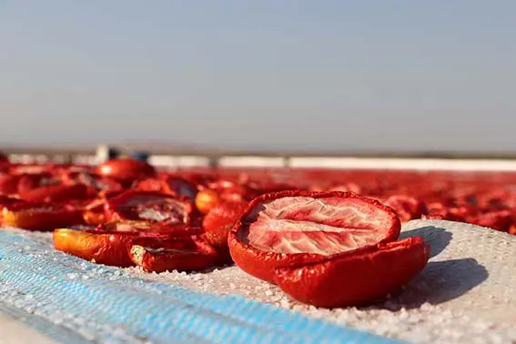 Bunaltıcı sıcakta tarlalarda işçilerin topladığı domatesler araçlarla getirildiği kurutma alanında yüzlerce kişi tarafından ikiye kesilerek, örtüye serilip tuzlanıyor. Kurutma işleminin ardından domatesler, firmalar aracılığıyla ABD ile Arap ve Avrupa ülkelerine ihraç edilecek.