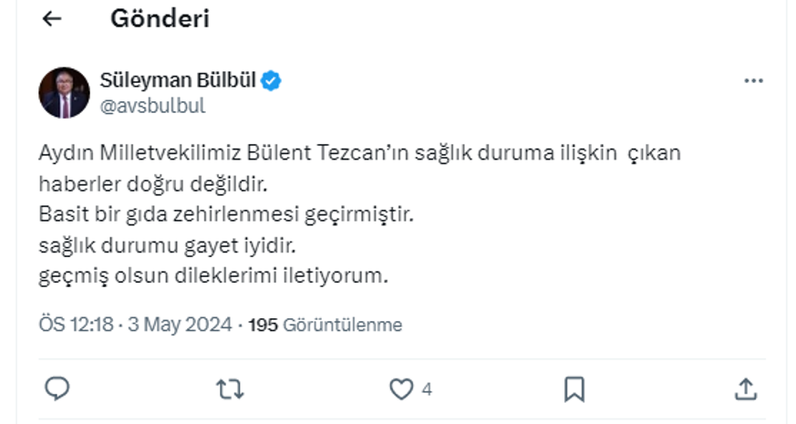 Bülbül, sosyal medyadan yaptığı paylaşımda, "Aydın Milletvekilimiz Bülent Tezcan’ın sağlık duruma ilişkin çıkan haberler doğru değildir. Basit bir gıda zehirlenmesi geçirmiştir. sağlık durumu gayet iyidir. geçmiş olsun dileklerimi iletiyorum" açıklamasında bulundu.