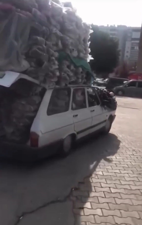 Hem bagajda, hem de otomobilin tavan kısmında yüklü miktarda torbalarla eşya taşıyan sürücü bu görüntüsüyle kamyonetlere adeta kafa tuttu.