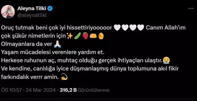 Aleyna Tilki, sosyal medya hesapları üzerinden ramazanın manevi atmosferine uygun bir paylaşım yaptı. Paylaşımında oruç tutmanın kendisini iyi hissettirdiğini belirten genç popçu, dualarını da hayranlarıyla paylaştı. İşte, Aleyna Tilki'nin o duygu dolu paylaşımı: