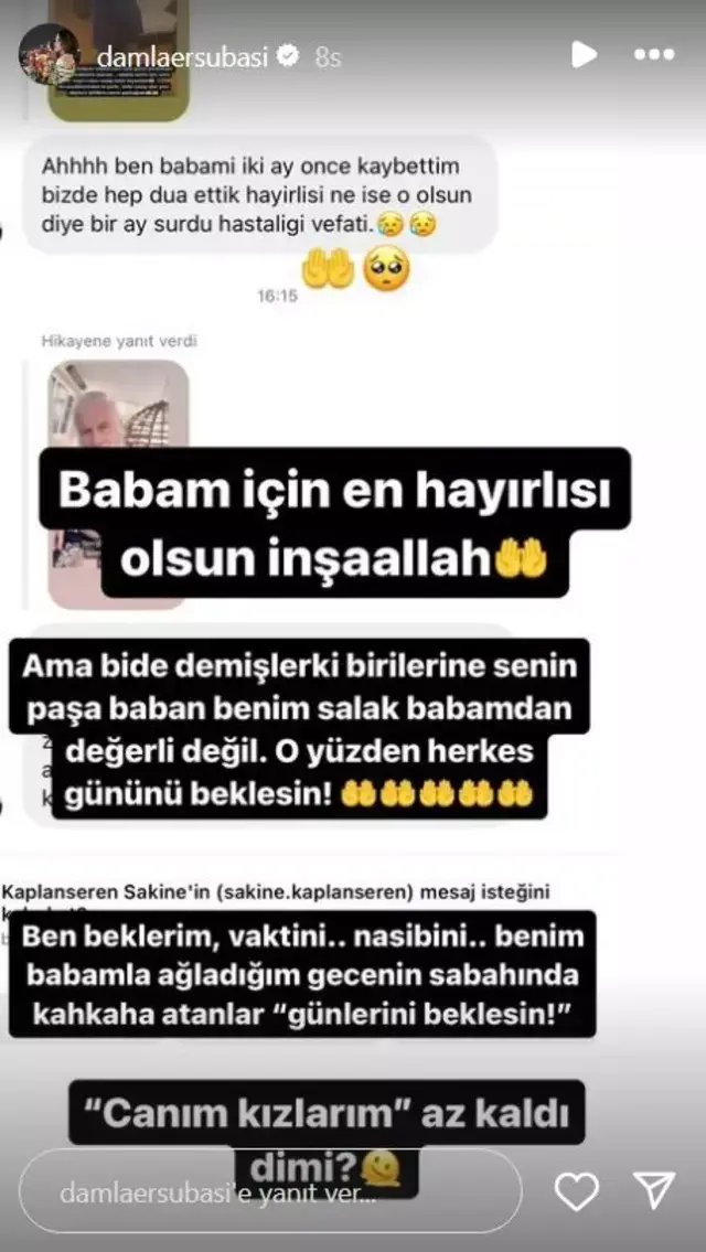 Babasının ölümünü paylaşırken Ersubaşı, "Gitti pamuğum bitti her şeyim" şeklinde duygusal bir ifade kullandı. Ancak ardından gelen ifadeler, paylaşımın tonunu tamamen değiştirdi.