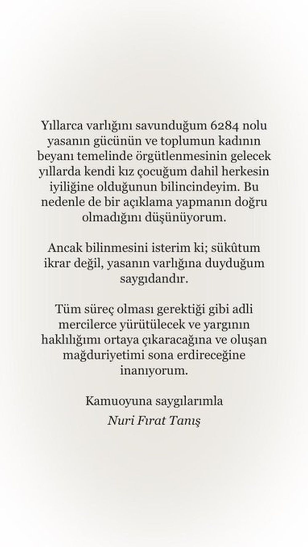 "Eylül ayı sonunda beraberliğimi sonlandırdığım Nuri Fırat TANIŞ'ın ayrılık sonrasında beni, ailemi ve yakınlarımı içine çektiği süregelen ağır psikolojik şiddet, tehdit, ısrarlı takip sarmalına karşı uzaklaştırma kararı almış bulunuyorum. Yaşadığım bu tecrübe benim için "yanlış bir seçimdi" deyip geçemeyeceğim kadar yıpratıcı ve ürkütücü, sürreal bir hikayeye dönüşmüştür. Maruz kaldığım şiddet sarmalı bana, aileme ve yakın çevreme şu ana dek hiç karşılaşmadığımız, tanık olmadığımız tarifi ve tahmini mümkün olmayan hisler yaşatmış ve bizde derin yaralar açmıştır. "