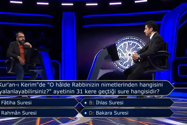 300 bin TL değerindeki soruda, "Kur'an-ı Kerim'de 'O halde Rabbinizin nimetlerinden hangisini yalanlayabilirsiniz?' ayeti kaç surede geçmektedir?" sorusu yöneltildi. Yarışmacı, heyecanına yenik düşerek "D Bakara" cevabını verdi. Ancak bu cevap yanlış oldu.