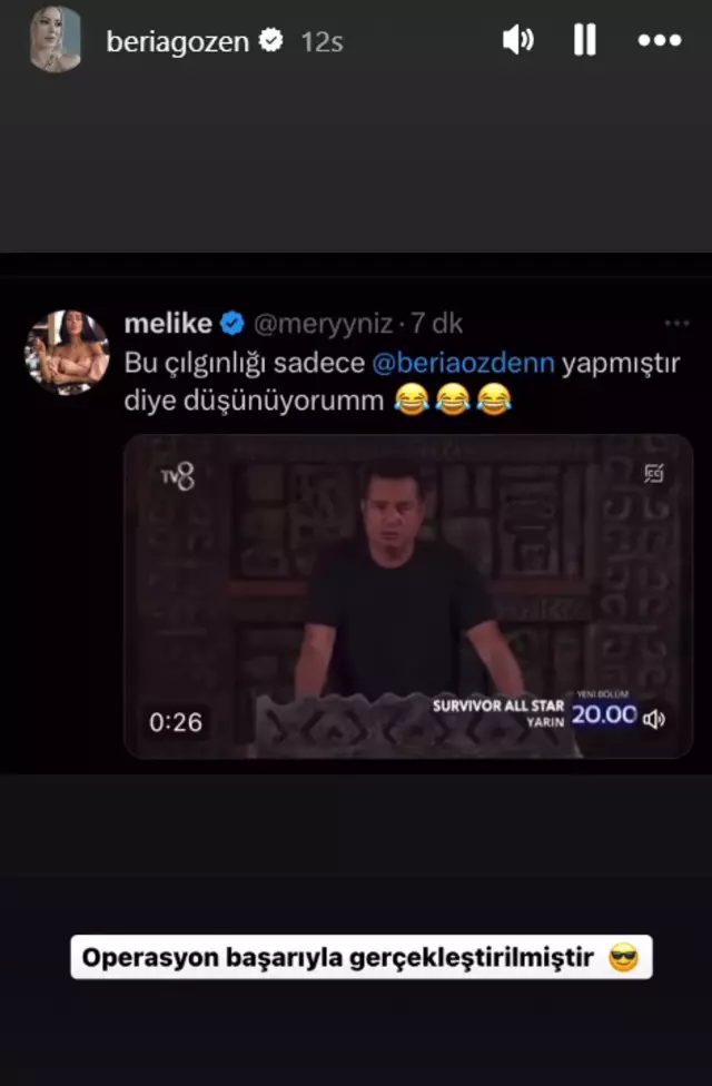 Ilıcalı'nın "Artık işi operasyona bağlamış" sözlerine atıfta bulunan bir paylaşım yapan Beria Gözden Özden "Operasyon başarıyla gerçekleşmiştir." ifadelerini kullandı.