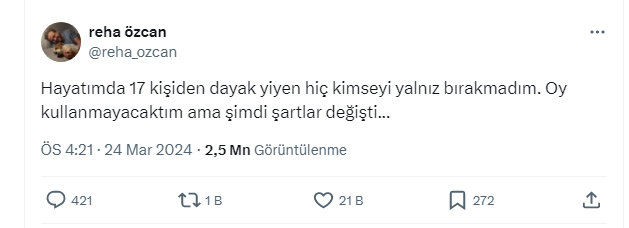 Özcan, sosyal medya hesabından yaptığı paylaşımda, "Hayatımda 17 kişiden dayak yiyen hiç kimseyi yalnız bırakmadım. Oy kullanmayacaktım ama şimdi şartlar değişti…" ifadelerini kullandı.