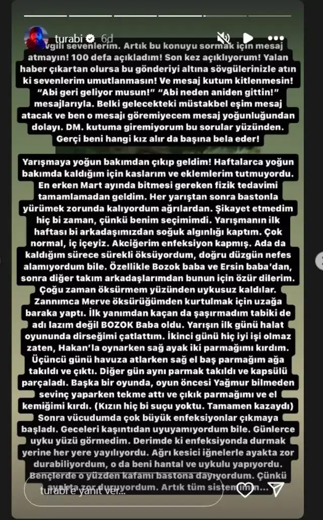 Turabi, adada yaşadığı sağlık sorunlarının ardından kendisine sürekli olarak geri dönmesi için gelen mesajlardan bıkmış durumda. Yoğun bakımdan çıkıp geldiğini ve durumunun ciddiyetini vurgulayan Turabi, artık yarışmaya dönmeyeceğini net bir şekilde ifade etti. Bu süreçte yaşadığı sıkıntıları ve adada geçirdiği günleri detaylı bir şekilde anlatarak, mesajlardan bıkmışlığını dile getirdi.