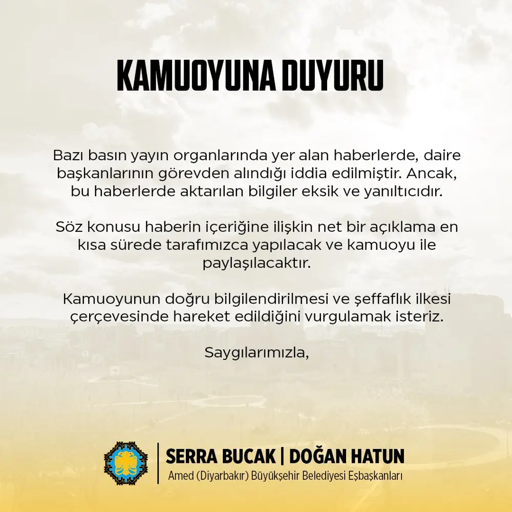 Bazı medya ve basın, yayım kuruluşlarında yer alan haberlere göre, “Kayyım yönetiminin 11 daire başkanı görevden alındı” iddiaları ortaya atılmış ve isim isim, birim birim görevden alınan liste ortaya konmuştu. Diyarbakır Büyükşehir Belediyesi Eşbaşkanları Serra Bucak ve Doğan Hatun’dan Diyarbakır Büyükşehir Belediyesinin resmi X hesabından konuya ve haberlere yalanlama gecikmedi. Olası bir durumda bilgi verileceği belirtildi.