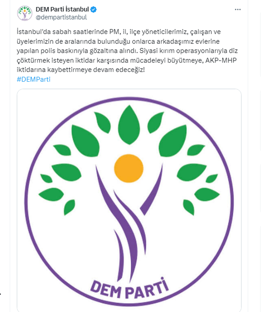 Gelişmeyi, DEM Parti İstanbul, sosyal medyadan duyurdu.