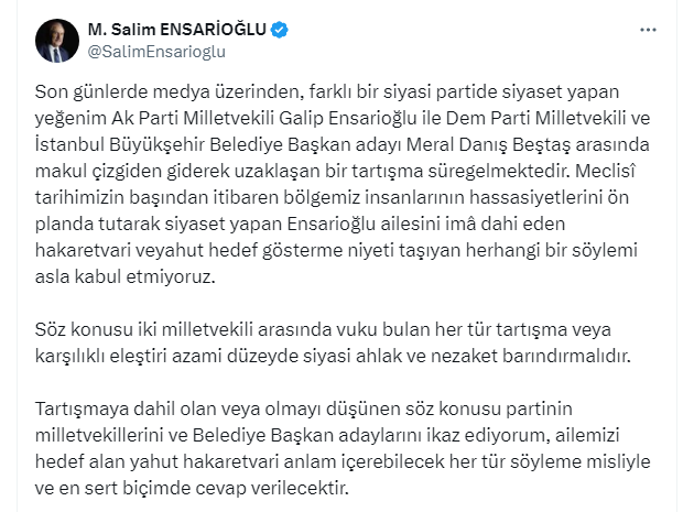 Sosyal medya hesabından paylaşımda bulunan Salim Ensarioğlu, şu ifadeleri kullandı: “Son günlerde medya üzerinden, farklı bir siyasi partide siyaset yapan yeğenim Ak Parti Milletvekili Galip Ensarioğlu ile Dem Parti Milletvekili ve İstanbul Büyükşehir Belediye Başkan adayı Meral Danış Beştaş arasında makul çizgiden giderek uzaklaşan bir tartışma süregelmektedir.