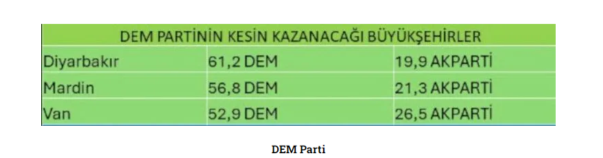 (Buralarda hangi partinin kazanacağı kesin olarak söylenemez) Ancak seçmen psikolojisinin kutuplaşmanın etkisi ile muhalefetten yana ağır bastığını söyleyebiliriz. DEM Parti 3 büyükşehirde kesin kazanacak.