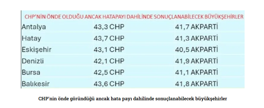 Ankete göre İstanbul'da Ekrem İmamoğlu, rakibi Murat Kurum karşısında 7 puan farkla yarışı önde bitiriyor. Antalya ve Hatay gibi bıçak sırtı şehirlerde de CHP adayları yarışı küçük farklarla önde tamamlıyor.
