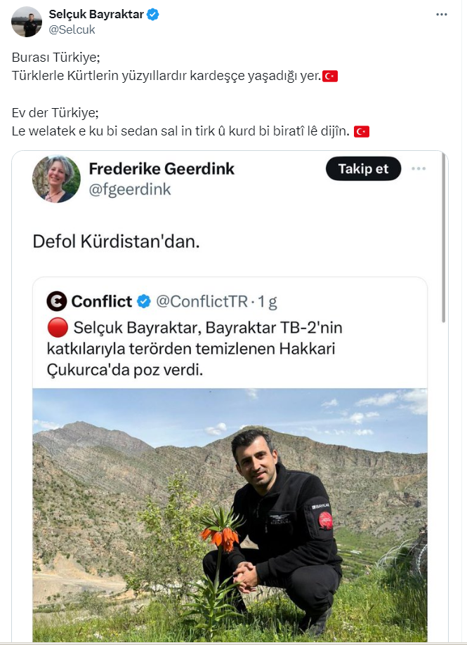 Frederike Geerdink X hesabından, Bayraktar'ın Hakkari'den paylaştığı fotoğrafı alıntılayarak "Defol Kürdistan'dan" ifadelerini kullandı.