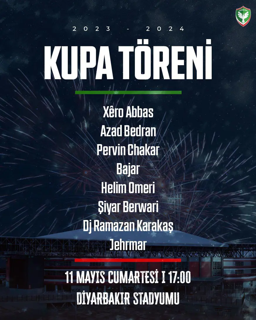 11 Mayıs Cumartesi günü organize edilecek kupa törenine, Xêro Abbas, Azad Bedran, Pervin Chakar, Bajar, Helim Omeri, Şiyar Berwari, Dj Ramazan Karakaş ve Jehrmar'ın kupa törenine katılacağı duyuruldu.
