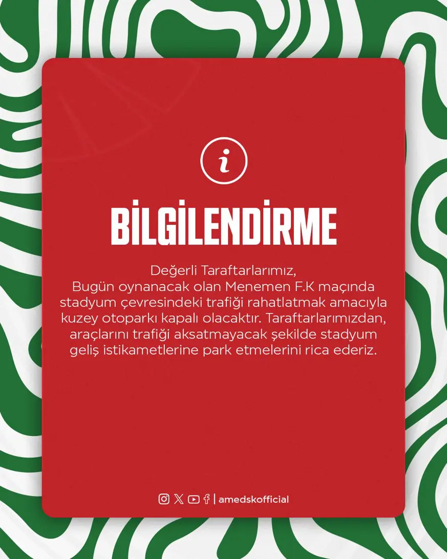 Amedspor: Değerli Taraftarlarımız, Bugün oynanacak olan Menemen F.K maçında stadyum çevresindeki trafiği rahatlatmak amacıyla kuzey otoparkı kapalı olacaktır. Taraftarlarımızdan, araçlarını trafiği aksatmayacak şekilde stadyum geliş istikametlerine park etmelerini rica ederiz.