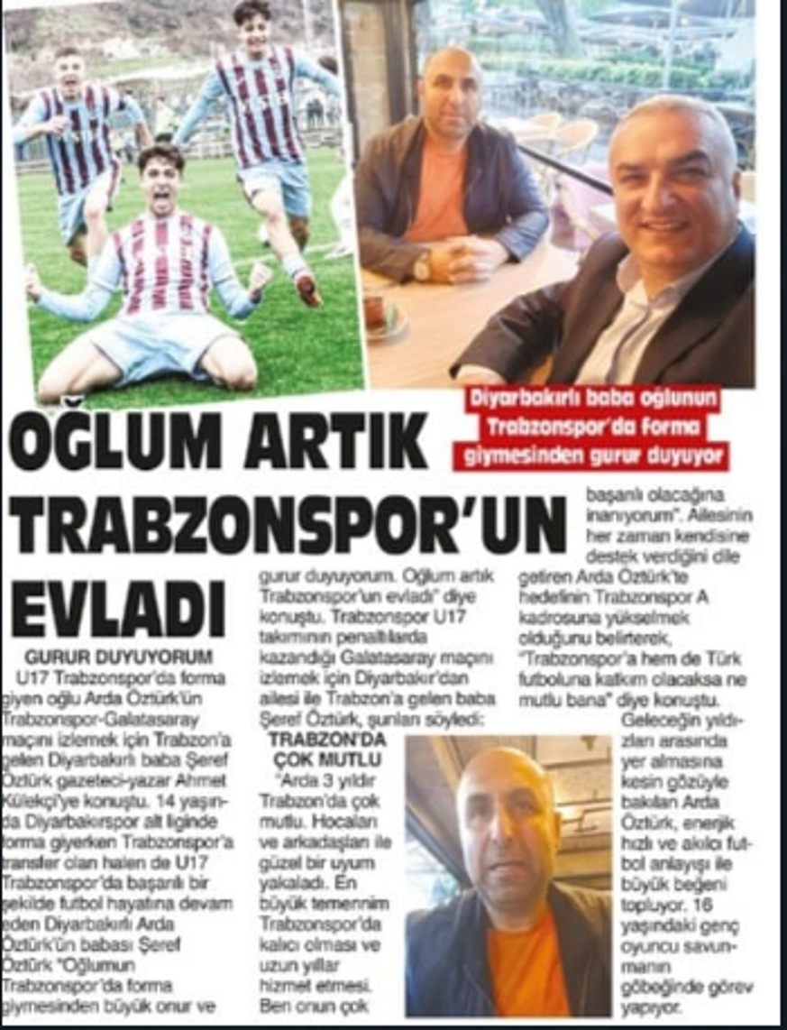 Diyarbakırlı Arda Öztürk bu sezon U19 takımı ile 18 maça çıktı 1 gol ve 3 asist yaptı.. Trabzon şehrini çok sevdiğini 4 yıldır alt yapısında mücadele ettiği Trabzonspor da ise kalıcı olmak istediğini belirten Arda Öztürk bana güvenleri mahcup etmeme adına çok çalışacak Trabzonspor formasının büyüklüğüne layık olacağım dedi.