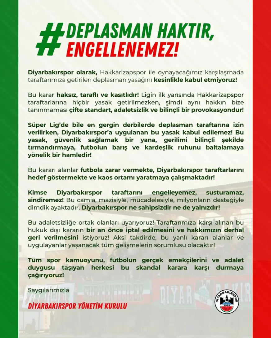 Diyarbakırspor olarak, "Hakkari Zapspor ile oynayacağımız karşılaşmada taraftarımıza getirilen deplasman yasağını kesinlikle kabul etmiyoruz!