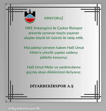 2.Lig Beyaz Grup ekibi Diyarbekirspor, yaşanan saldırıyı kınayarak hakem Halil Umut Meler ve yardımcılarına geçmiş olsun dileklerini iletti.