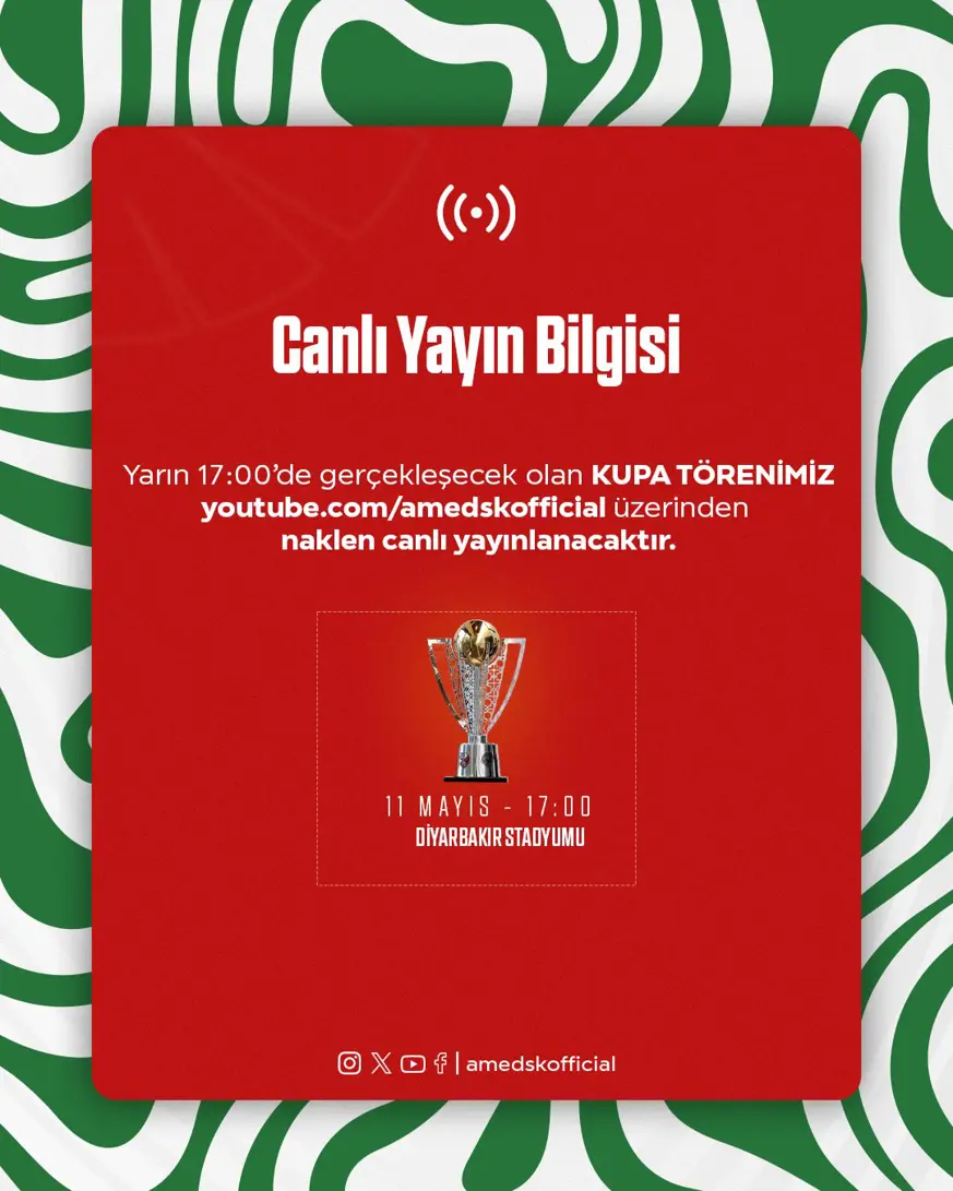 Türkiye 2'nci Ligi Kırmızı Grupta şampiyon olan Amedspor'un Şampiyonluk kupa töreni yarın Cumartesi günü Akşam Saat 17.00'de Amedspor'un Yutube kanalı üzerinden naklen canlı yayınlayacak.