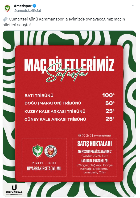 Amedspor’ın liderlik için kendi sahasında 2 Mart Cumartesi saat 14:00’da karşılaşacağı konuk takım Karamanspor maçının biletleri erkenden satışa sunuldu.