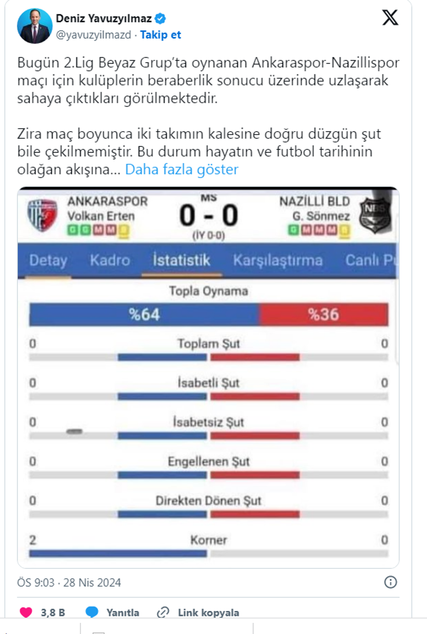 "Bugün 2.Lig Beyaz Grup’ta oynanan Ankaraspor-Nazillispor maçı için kulüplerin beraberlik sonucu üzerinde uzlaşarak sahaya çıktıkları görülmektedir. Zira maç boyunca iki takımın kalesine doğru düzgün şut bile çekilmemiştir. Bu durum hayatın ve futbol tarihinin olağan akışına aykırıdır.