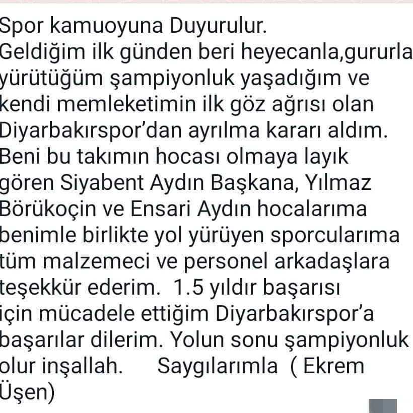 Bölgesel Amatör Futbol Ligi(BAL) 9.Grup'ta şampiyonluk mücadelesi veren Diyarbakırspor'da teknik direktör Ekrem Üşen görevinden istifa ettiğini açıkladı.