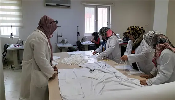 Şanlıurfa'da kadın kursiyerler, Kahramanmaraş merkezli depremlerden etkilenen Adıyaman'daki depremzedeler için kışlık giysi hazırlıyor.